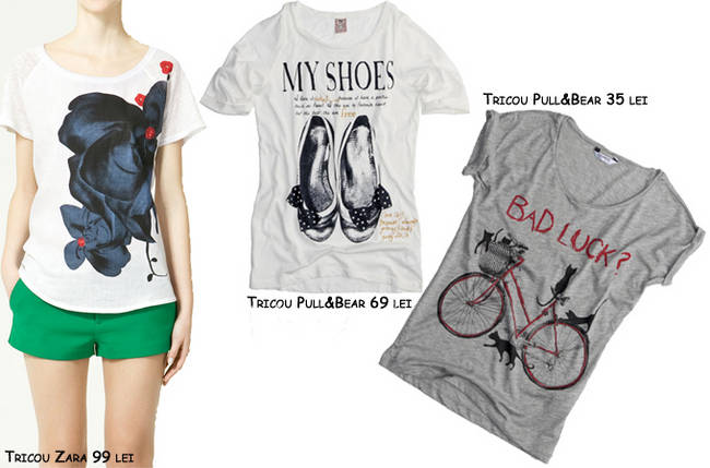 Saptamana trecuta am pledat pentru tricourile simple. Fara a minimaliza rolul lor esential in garderoba fiecarei femei, azi am sa prezint cateva dintre tricourile cu imprimeuri propuse de colectiile Zara, Pull & Bear si Mango pentru aceasta primavara. Combina-le cu o pereche de skinny jeans sau baggy jeans, cu pantaloni scurti, fuste scurte sau maxi; cu bascheti, sandale cu talpa plata sau cu toc pentru a obtine fie tinute casual, fie sport.